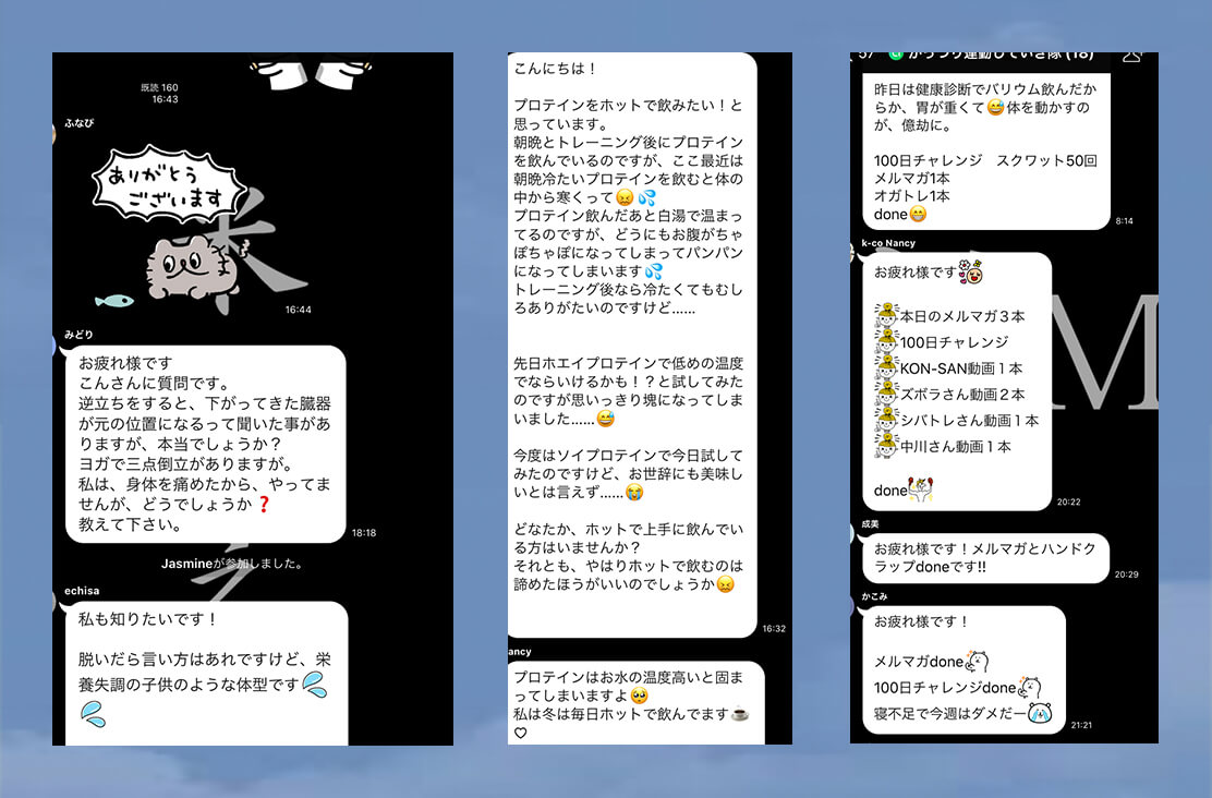 オープンチャット「待合室」では盛んに交流が。「何食べてる?」「ヨガマットどんなの使ってる?」など、同じ目標に向かう仲間がたくさんいます!